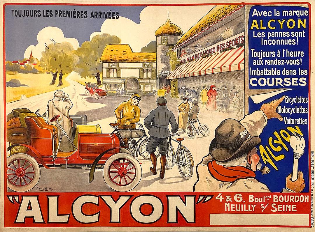 A car and bicycle, both made by Alcyon, win their races in this early automobile and cycling poster by Marcel Bloch. "Always the first to arrive" is the slogan here - and we can tell our racers have won by a long shot. They chat with one another, calm and collected, as the runners up begin to arrive. In the foreground, a man is posting an advertisement for Alcyon which reads in French, "With Alcyon Brand, breakdowns are unknown! Always on time for appointments, unbeatable in races."