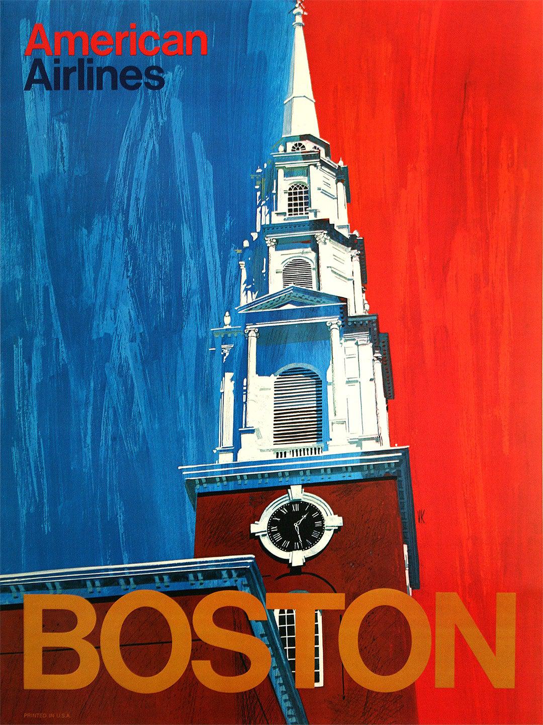 The historic architecture of Boston is on display in this poster for American Airlines. The clean lines and simple layout were a shift in advertising design away from the illustrative posters of the 1960s.