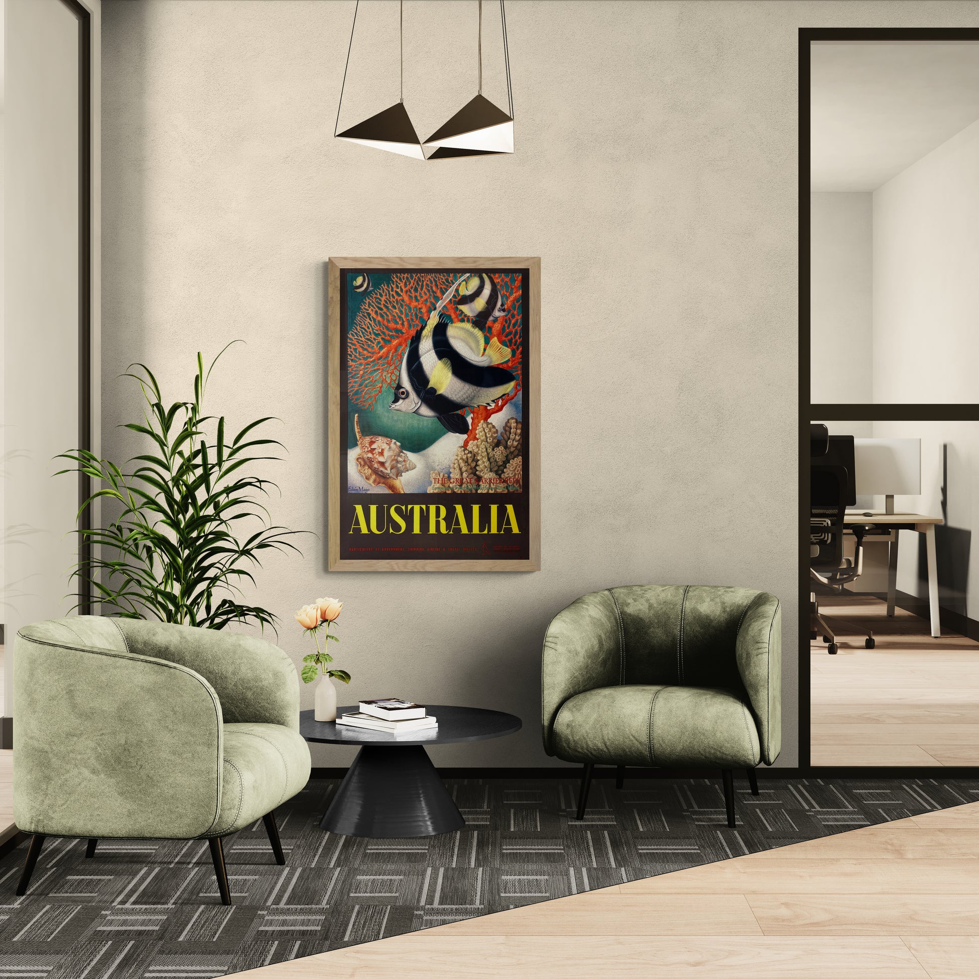 This original vintage travel poster, titled “Australia – The Great Barrier Reef,” was created in 1956 by Eileen Mayo for the Australian National Travel Association. It is one of the most celebrated examples of mid-century Australian travel advertising, brilliantly capturing the wonder and biodiversity of the world’s largest coral reef system. The composition features a richly stylized underwater scene, teeming with fish, coral, and marine flora rendered in bold, naturalistic colors. Mayo’s intricate detailing and balanced composition invite viewers into a magical aquatic world—simultaneously educational and awe-inspiring.Eileen Mayo (1906–1994) was a British-born artist, designer, and printmaker who later became a major artistic voice in both New Zealand and Australia. Trained at the Slade School of Fine Art in London and later under Claude Flight at the Grosvenor School of Modern Art, Mayo's career spanned book illustration, painting, tapestry, and poster design. She was especially known for her scientific accuracy combined with a strong design sense—a rare combination that made her work particularly well-suited to natural subjects and public commissions.After emigrating to Australia in the early 1950s, Mayo quickly became an integral figure in the Australian art world. She designed postage stamps, illustrated educational materials, and worked closely with government agencies on visual campaigns, including those promoting tourism and environmental awareness. Her work is characterized by a deep respect for nature, clarity of form, and a graceful merging of art and science.This poster exemplifies Mayo’s talent for transforming biological detail into captivating visual storytelling. Her sensitivity to nature and compositional discipline make this one of the finest Australian travel posters ever produced.This is an Original Vintage Poster; it is not a reproduction. It is conservation mounted, linen backed, and in excellent condition. We guarantee the authenticity of all our posters.