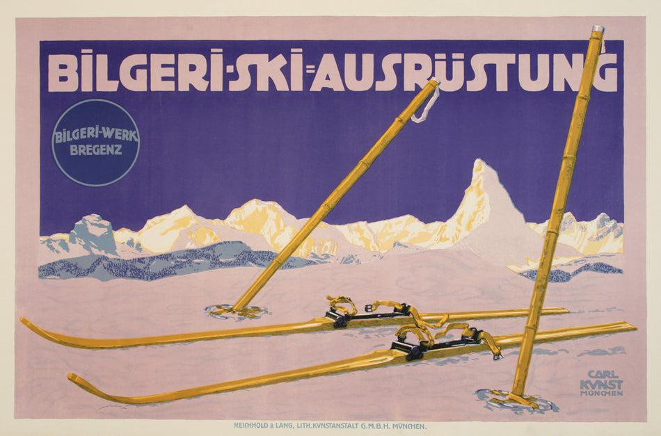 Carl Kunst created this vintage ski poster circa 1915. Besides his career as an artist, Kunst was also a mountaineer, making him perfect to design this ad for the Munich-made ski equipment company Bilgeri-Ski Ausruestung. He used this design for another ski poster a year later in which he added a skier fastening his bindings and adjusted the mountains in the background for another ski equipment dealer in Berlin. It is said that the mountain in this image is of the Matterhorn in Switzerland