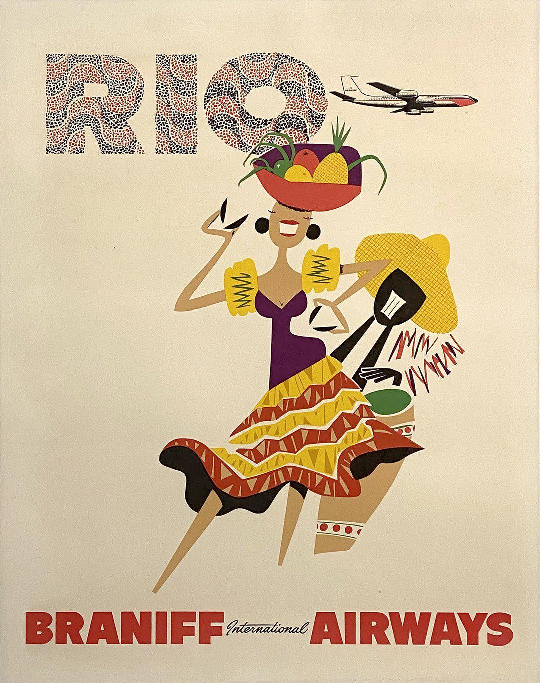 Rio de Janeiro is a city full of life, and this poster created by Braniff Airways seeks to highlight that spirit. A woman dances, castanets in hand while balancing a basket of fruit on her head. Behind her, a man taps away at his timbal drum.