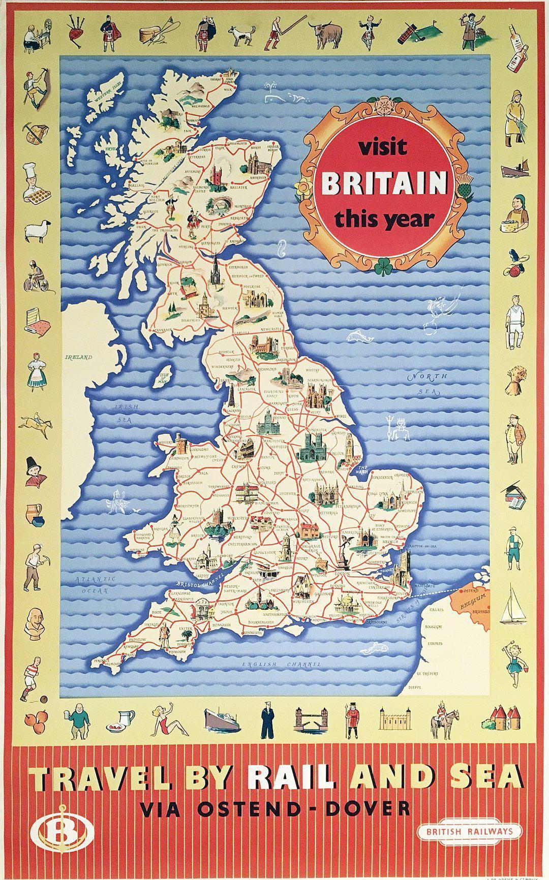 The poster is framed by caricatures of locations, wildlife, cultures and important architectural sites one can experience in Great Britain. The center portion of the poster, featuring the map of Britain similarly depicts all the attractions the country has to offer, this time, including red rail-lines which show the many different routes one can take to each site.