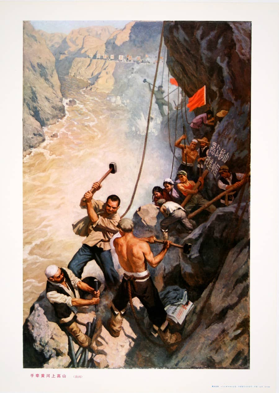 The words "Moving Mountains, Transforming China" inscribed on the rocks constantly inspire and encourage the villagers to rely on self-reliance and hard work. They passionately rearrange the land, brimming with the spirit to battle the elements and conquer the challenges. Hand in hand, they guide the waters of the Yellow River to irrigate their fields, completely altering the once barren and impoverished landscape of the mountainous region. The poster symbolizes their efforts to achieve agricultural prosperity for the benefit of future generations.