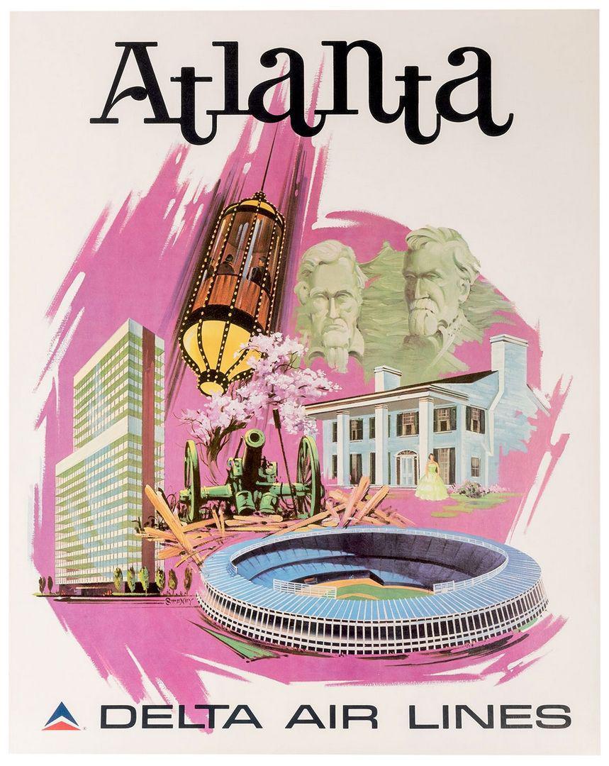Delta Air Lines commissioned the artist named Fred Sweney (1912 - 1996) to design a group of travel posters in his style and with similar features to promote various domestic destinations. Each poster in the series shows the notable sites in the city. The posters in this series were distributed to travel agents as well as to Delta ticketing offices . In this case we see some of the classic things associated with Atlanta – Architecture both old and new, Stadium, Southern Lifestyle.
