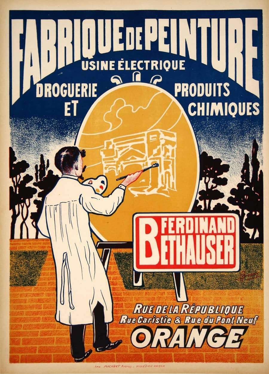 This is an original stone lithograph from the 1920s. It shows an artist at his canvas using painting products produced by Ferdinand Bethauser. The image includes the address of Ferdinand Bethauser's store in Paris which sells canvas and other artist supplies.