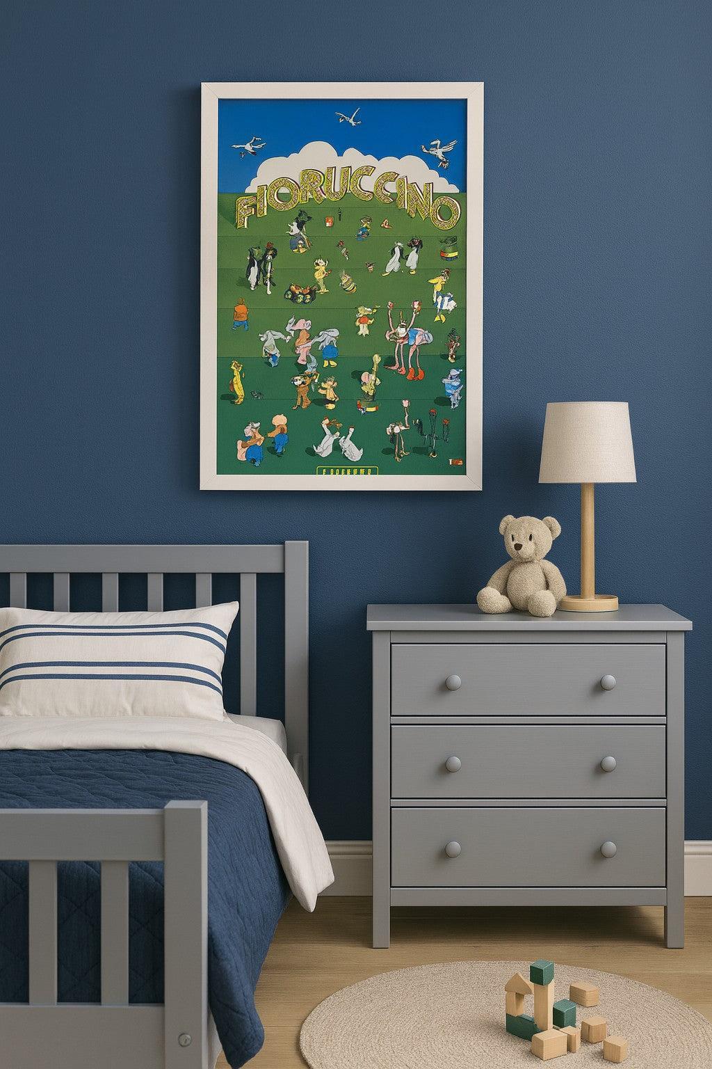 A parade of cartoon animals marches across a banded green lawn beneath a blue sky and a puffy white cloud, where the word “Fioruccino” arcs in harlequin-patterned letters. Penguins, ostriches, ducks, pigs, and a menagerie of whimsical characters play with toys and mini vehicles, their flat pop colors and crisp outlines telegraphing child-friendly fun. The small Fiorucci cartouche at bottom ties the image to the brand’s children’s line; designer uncredited (typical of Fiorucci’s studio-driven visuals, late 1970s–early 1980s).“Fioruccino” was the label’s dedicated range for kids—essentially a playful diminutive of Fiorucci—covering scaled-down denim, tees, and accessories. The sub-label leaned on bright, cartoon-style art and gentle humor to speak to children while still matching the parent brand’s pop sensibility. Characters like the ones here appeared across shop signage, hangtags, stickers, and packaging, so posters doubled as in-store décor and advertising. The lively palette and simple outlines made the graphics easy to read from a distance and instantly gift-able for nurseries and playrooms, which is why these pieces remain popular as wall art today.This is an Original Vintage Poster, it is not a reproduction. This poster is printed on heavyweight paper and in excellent condition. There may be some minor handling marks. We guarantee the authenticity of all our posters.