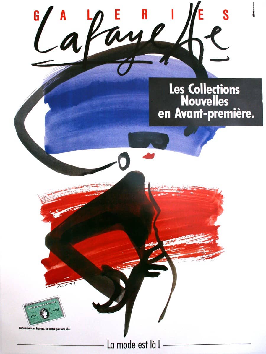 In celebration of previews for the newest fashion collections, this poster was created for the famous Galeries Lafayette department store in Paris. The artist, Mats (Mats Gustafson), uses an energetic and chic fashion sketch with the colors of the French flag.