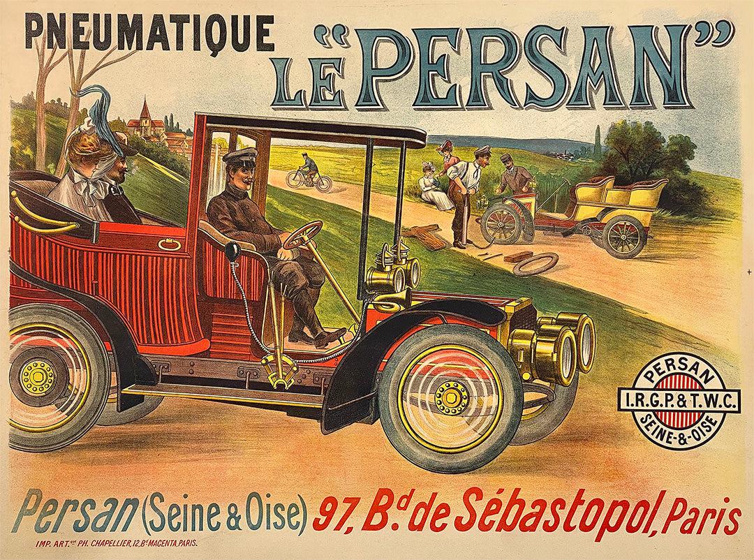 A well-to-do couple is chauffeured in their state of the art automobile with Persan Tires in this turn of the century poster. In the distance, another touring party is off the road replacing their tires. The message here is simple - enjoy a weekend ride in the country without issue when you use Persan brand tires.