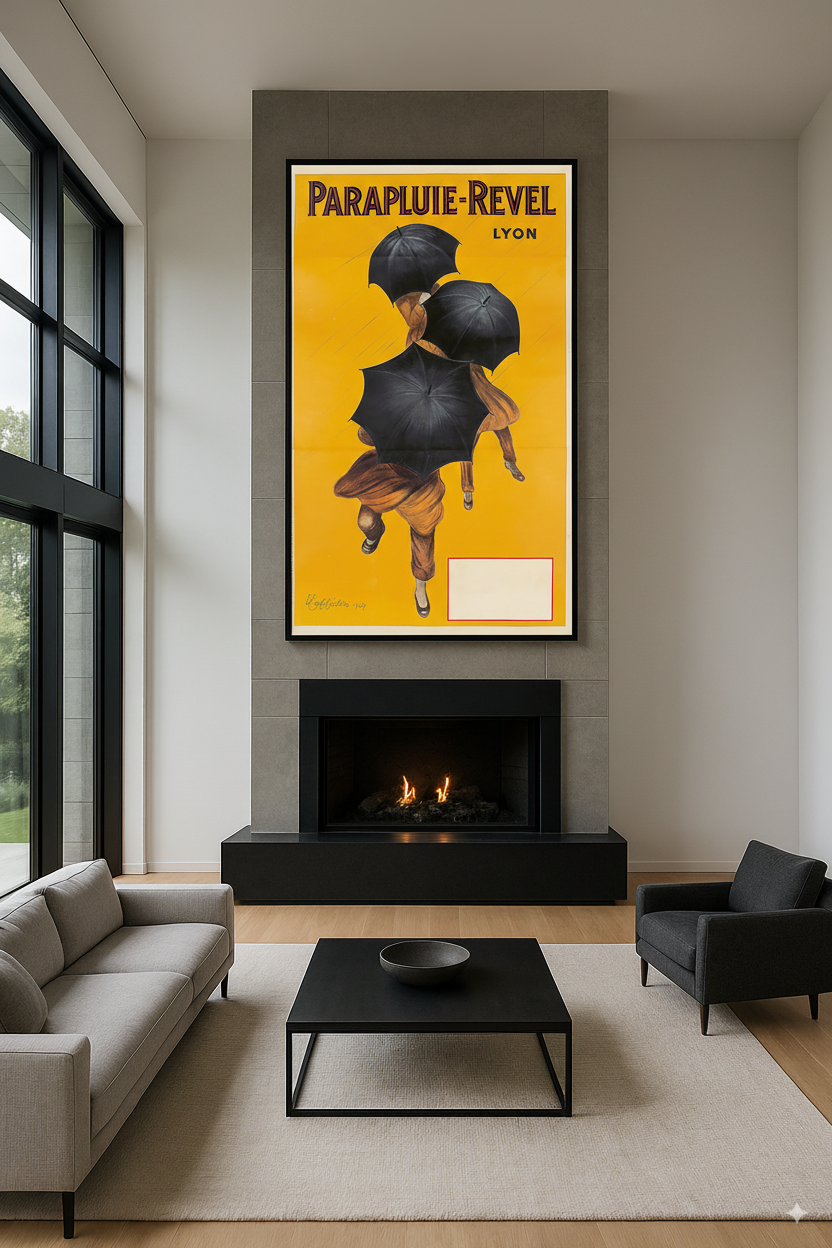 This original vintage poster was created in 1920 by renowned poster artist, Leonetto Cappiello. It is printed in an oversize format using stone lithography. The fine details of the artwork promote the umbrellas made in France by the Revel Company. These umbrellas shield their owners from the worst of downpours. The blank box in the lower right corner was intended for the local store to add their name and address to. This size of poster while very large is very dramatic when viewed in person. Leonetto Cappiello (1875-1942) designed many great posters during his long career. His innovative style featured oversized central figures in disproportion and usually against a dark background. This poster typifies that style. To learn more about the career of Cappiello, please follow this link: https://postergroup.com/blogs/the-ross-art-group-blog/for-the-love-of-cappiello This is an Original Vintage Poster; it is not a reproduction. This poster is conservation mounted, linen backed, and in excellent condition. We guarantee the authenticity of all of our posters.