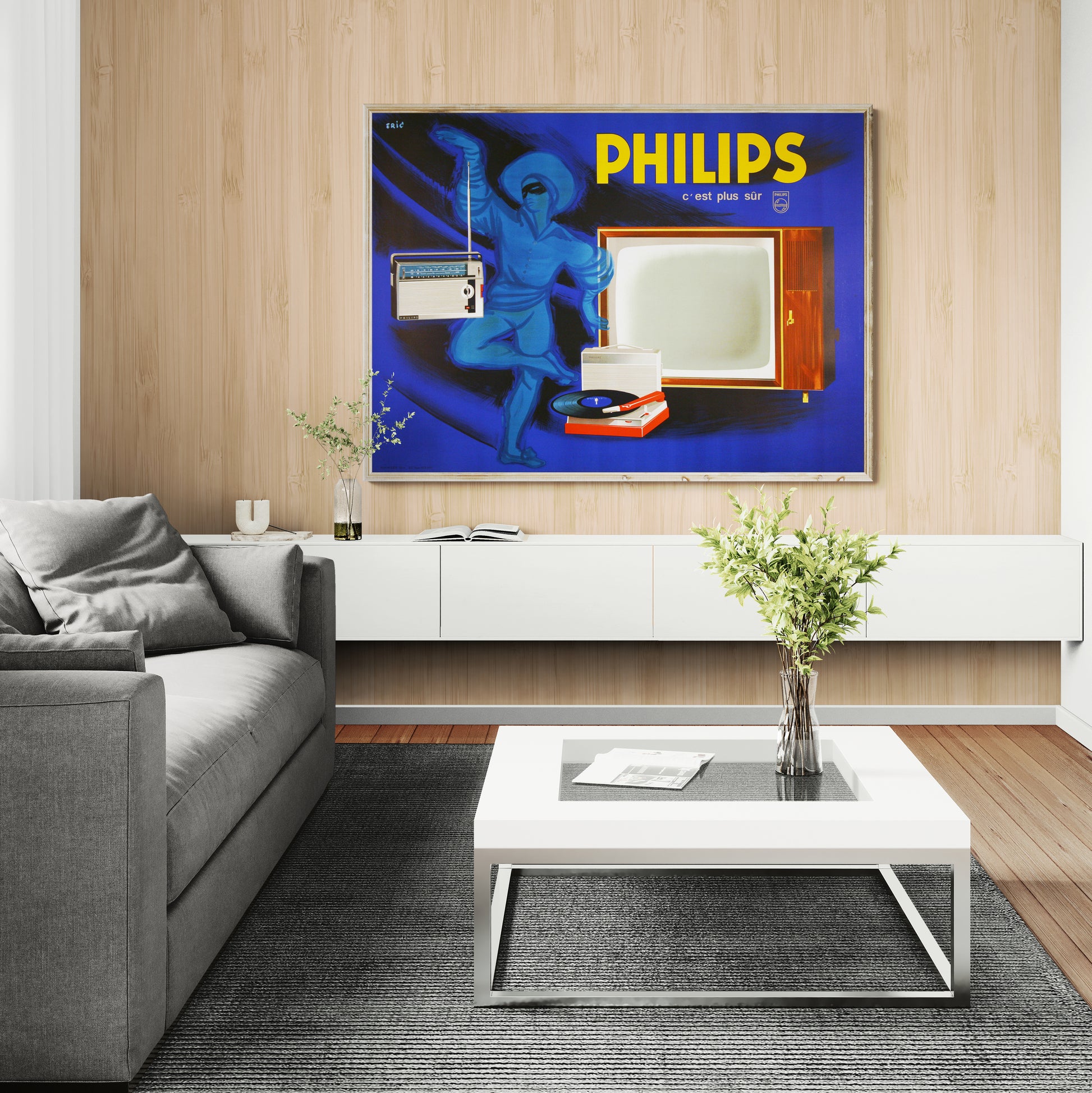 The mid 1950's was the beginning of a tremendous growth in the development of consumer electronics throughout Europe. The Philips Company was one of the largest of the manufacturers of radios, record players, and televisions as well as other household appliances. This poster advertises radios, record players and televisions and follows the style of other Philips posters in its horizontal orientation.