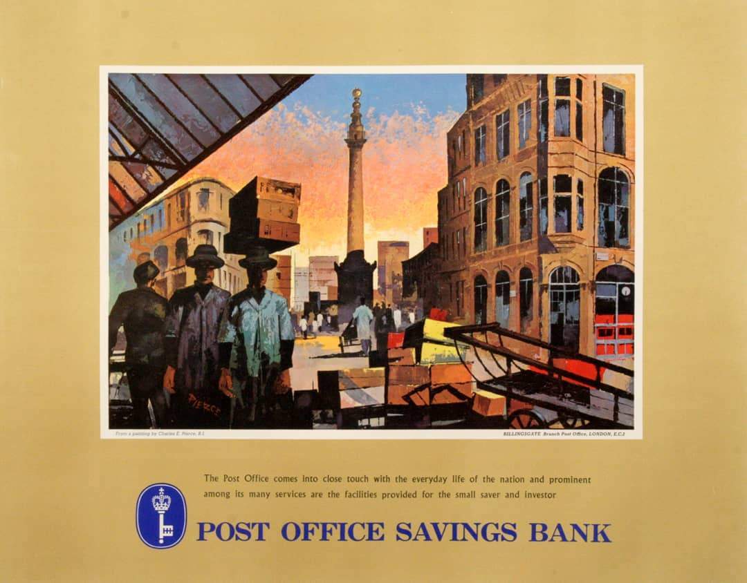Wherever You Go… Billingsgate is c.1940 branch advertisement by Pierce for the Post Office Savings Bank in the United Kingdom. Posters from this series depict regional branches of the Post Office Savings Bank throughout England, Scotland, and Ireland. Billingsgate is one of the many wards of London located on the north bank of the Thames river. Billingsgate was known as the water gate for the city, as well as host to London's major fish markets. The town is also mentioned in the "Sister Suffragette" song in Mary Poppins.
