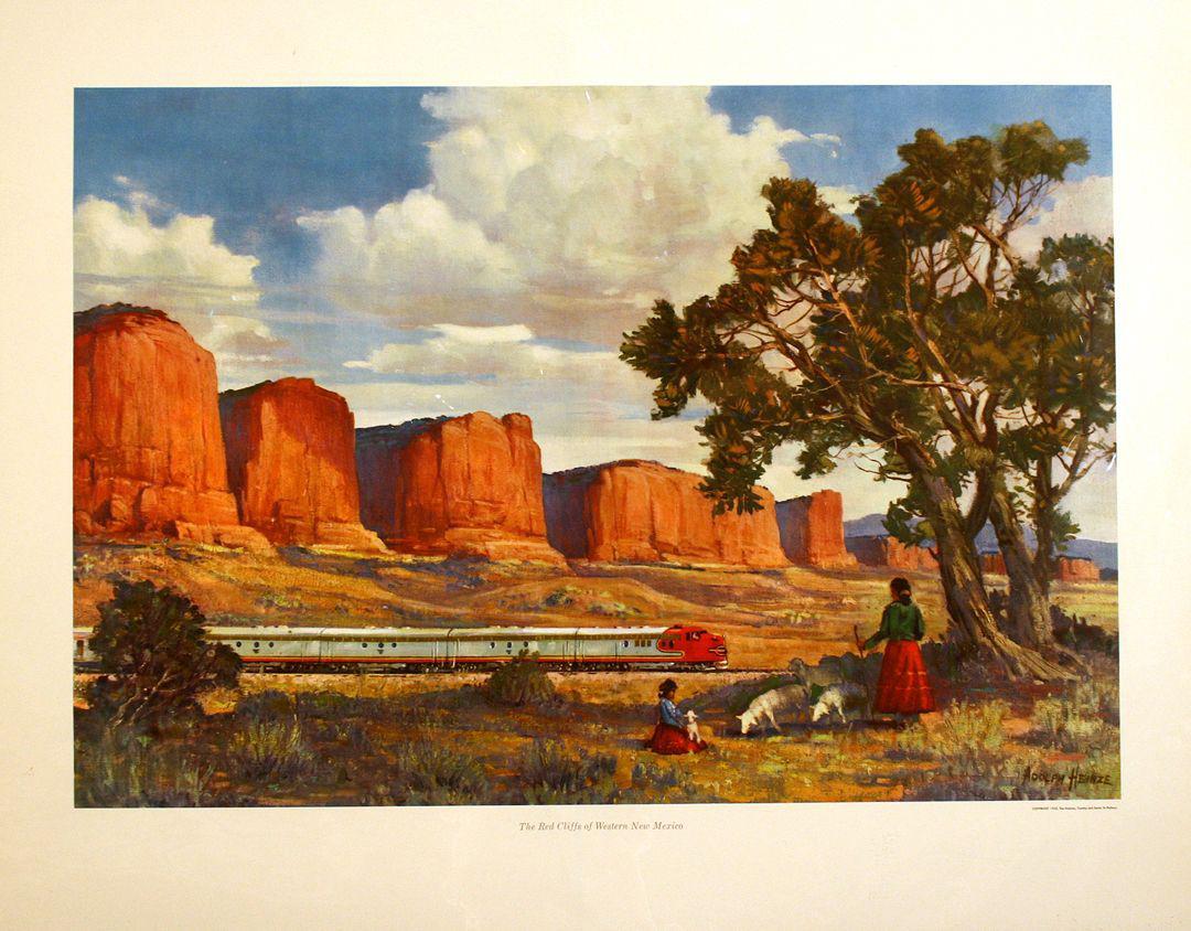 In this image by Adolph Heinze (1887 - 1958) we see the Santa Fe train speeding past the Red Cliffs of Western New Mexico with a Native American Mother and child in the foreground. The image invites the viewer to enjoy the newly expanded route of the railroad through the West and proudly displays the beauty of the Red Cliffs. Heinze was born in Chicago where he was trained in art. He was a member of the Painters and Sculptors of Chicago, the Chicago Gallery Association and the All-Illinois Society of Fine Art. Heinze painted many landscapes of the Rocky Mountains during his career and was known best for these paintings.