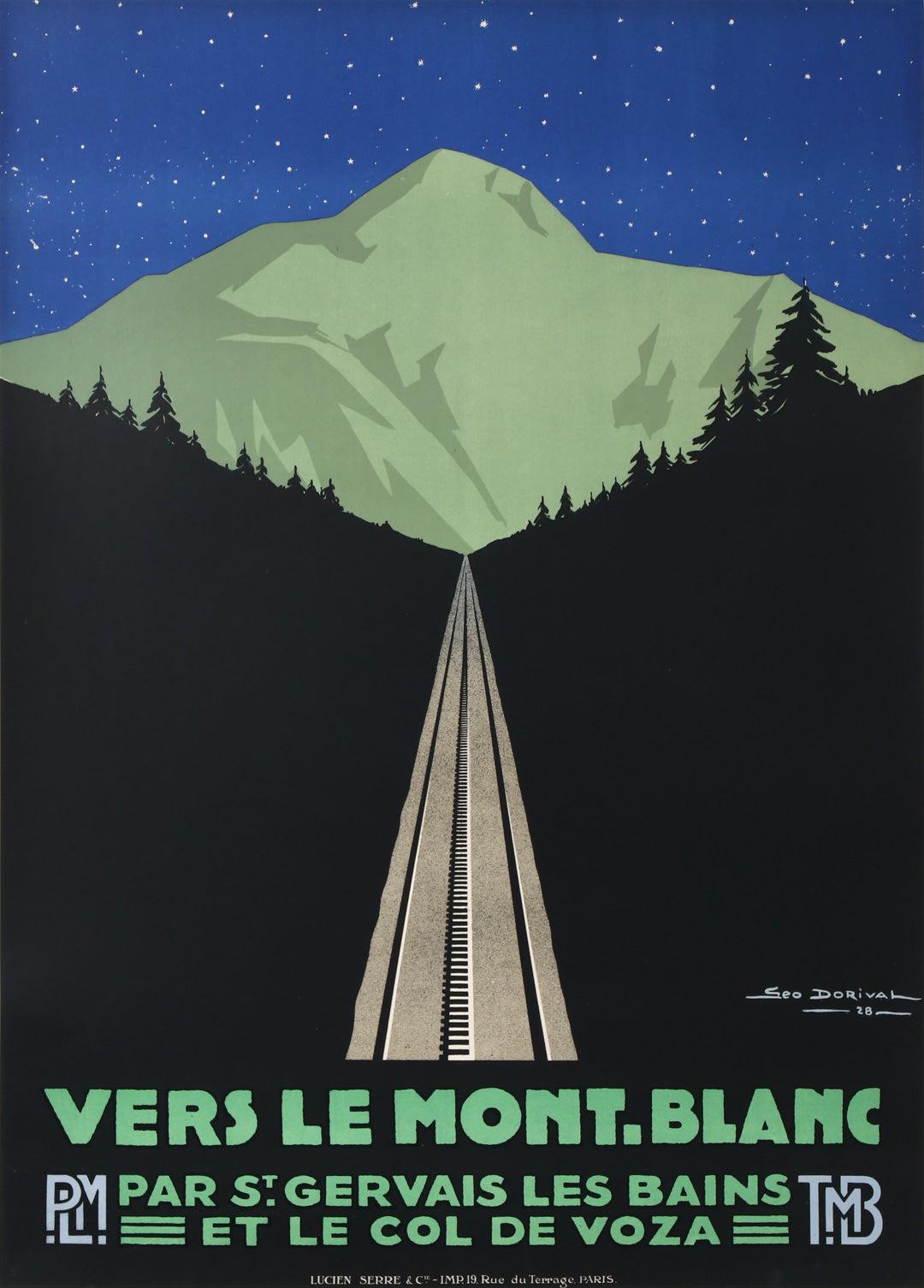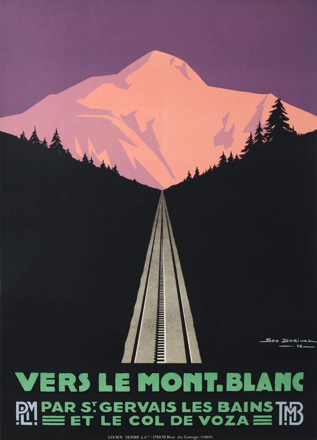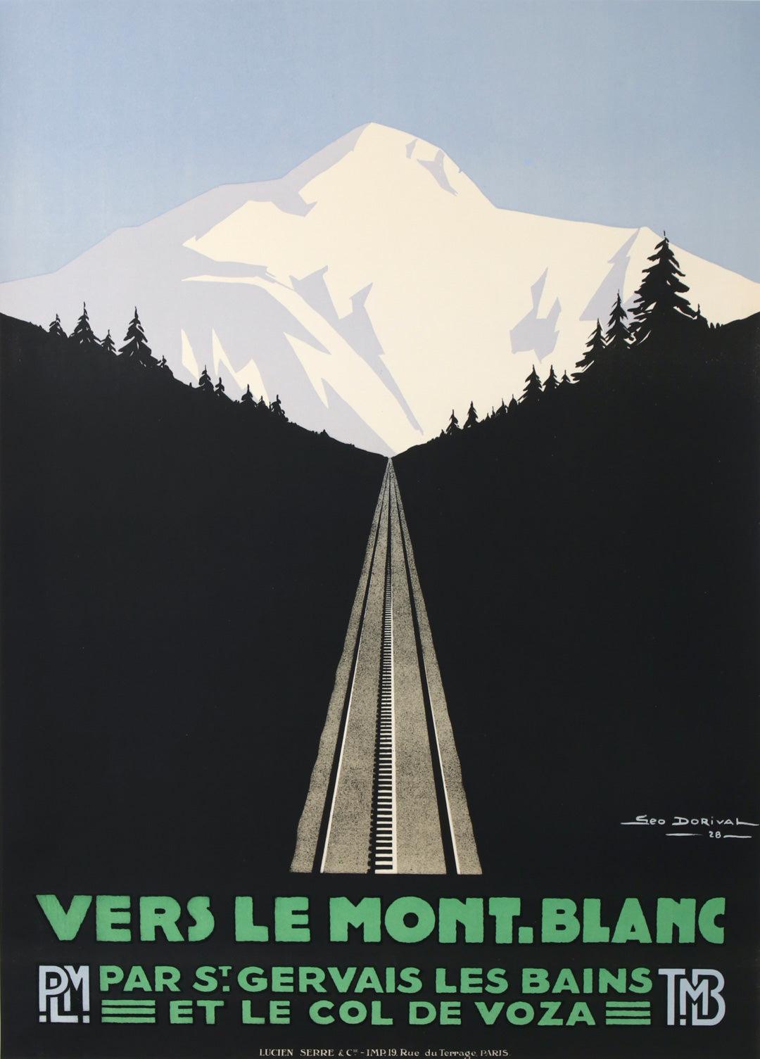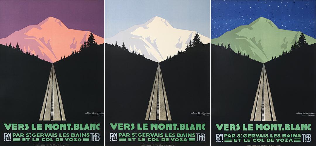 The artist, Georges Dorival, has created a triptych of images to portray the Mont Blanc vista in a minimalist fashion showing three times of day and their colors. The unifying theme is the stark beauty of Mont Blanc. The poster series was commissioned by the French National Railway PLM (Paris, Lyons, Mediterane’e - the three main hubs).