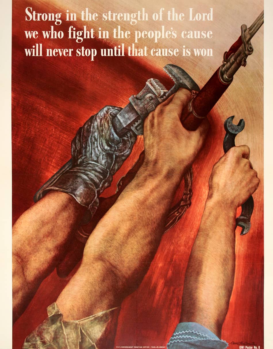 During World War 2 the United States Government issued a number of posters encouraging domestic workers to aid the war effort by increasing their production. This bold and well executed image very effectively stresses how teamwork and unity in the workplace leads to greater productivity.