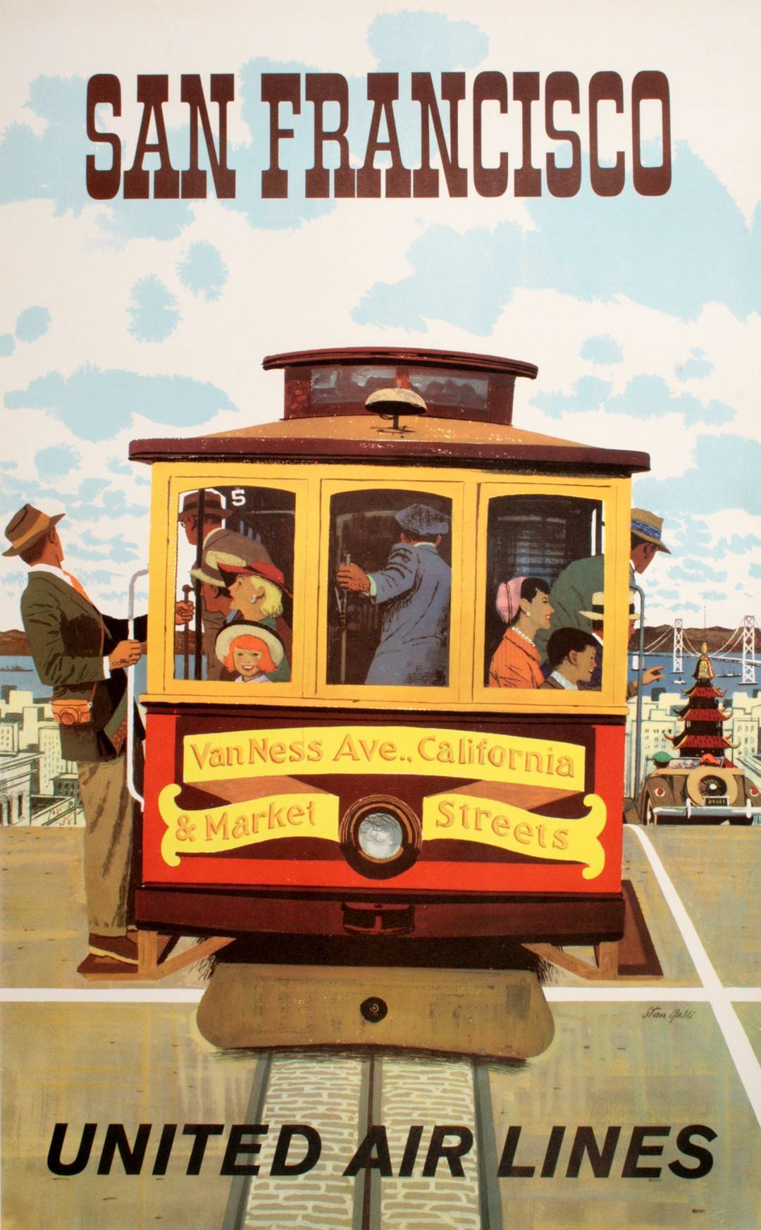 In this charming image of San Francisco, the artist Stan Galli portrays an iconic cable car that is transporting people to some of the downtown destinations in the heart of San Francisco.