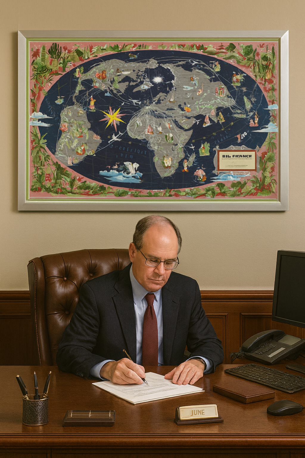 Created in 1959 by the artist Lucien Boucher, Air France Map - Blue Pink is one of a series of eight posters commissioned by Air France. These “Planispheres” were first produced in 1934 and documented Air France's ever expanding travel routes. Boucher created many of the Planispheres from 1934 to 1962 with increasing sophistication. In some he incorporated constellations and zodiacs. Many featured small local scenes from various countries in order to demonstrate the variety of destinations reached by Air France at that time. These posters were usually distributed to travel agents around the world as promotional items. The fine detail and colorful artwork make these maps highly desirable to collectors. Lucien Boucher (1889-1971) was a French graphic designer and illustrator most known to collectors for his many beautiful Air France travel posters. Boucher got his start as a cartoonist for the French humor magazine, Le Rire before moving into product and cinema poster design. He experimented in Surrealism, as well as Art Deco in his early advertising. Boucher's unique mid-century painting style combines his Art Deco influence and traditional painting to offer a fresh look for advertising. His body of work for Air France is well regarded by collectors as a leader in the mid-century style. Among these artworks are Boucher's series of “Planispheres,” which depicted the ever-expanding travel routes of the Air France airline. He completed the series of Planispheres from 1934-1962, continually developing the imagery with a fresh approach. This is an Original Vintage Poster; it is not a reproduction. This poster is conservation mounted, linen backed, and in excellent condition. We guarantee the authenticity of all of our posters.