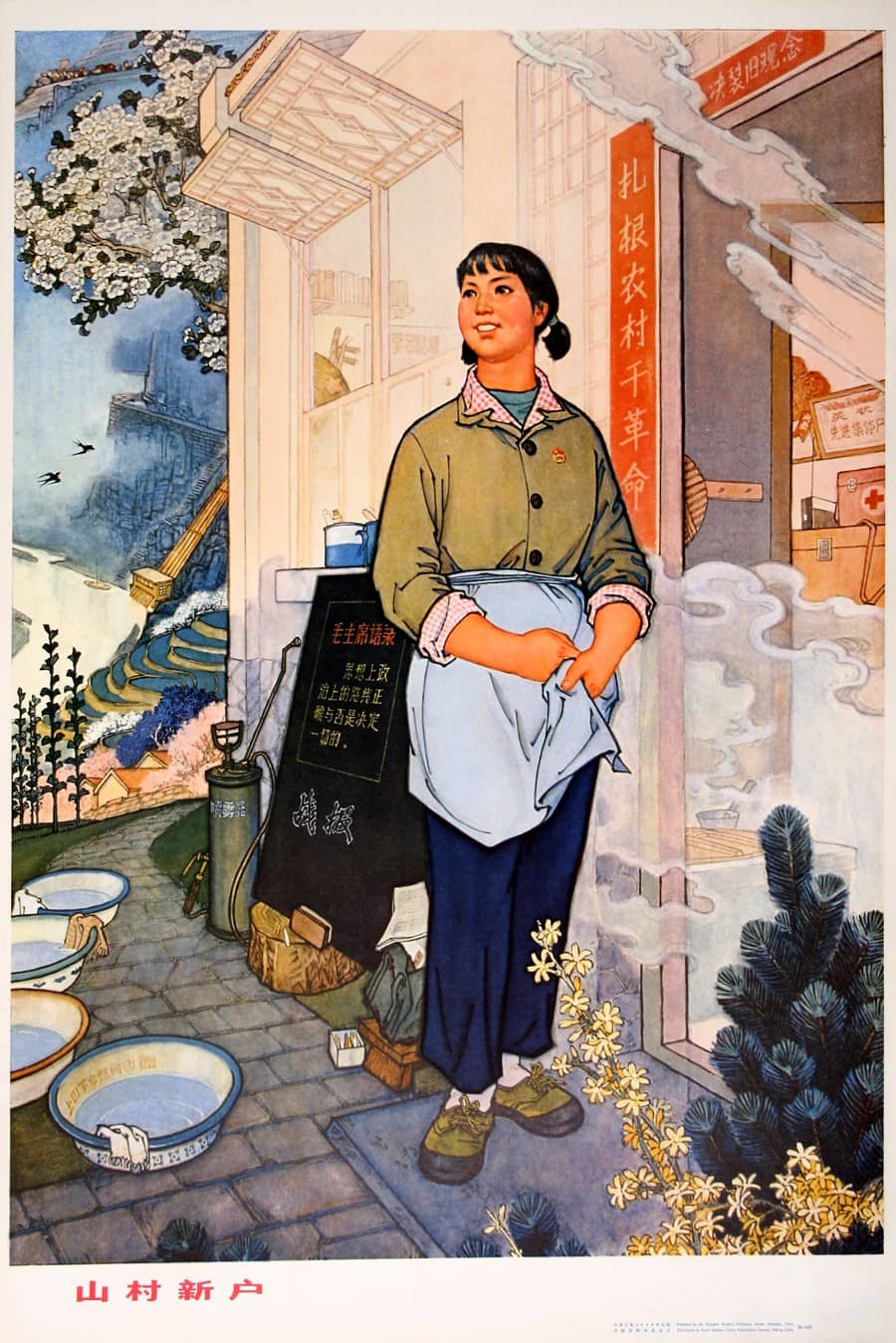 The poster titled "New House in the Mountain Village" depicts the late afternoon, as the workday for the production brigade draws to a close. The responsibility of preparing dinner at home falls upon a female educated youth (known as a "zhiqing"), who has taken extra care to cook a delicious meal and set out water for washing. Eagerly positioned at the doorway, she stands on tiptoes, rubbing her hands together, awaiting the return of her fellow zhiqing comrades from their work.
