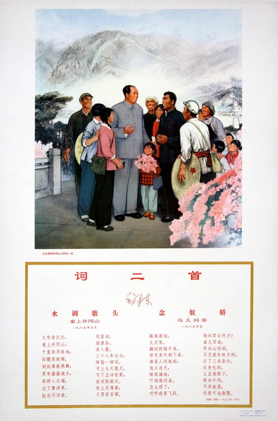 Jinggang Mountain holds profound historical significance as the initial revolutionary base of the Chinese Communist Party and a pivotal starting point for the success of the Red Army's revolutionary efforts, guided by Mao Zedong. The poster also features two of Mao's poems, which are particularly notable as they were the last ones published by Chairman Mao during his lifetime.The first poem, composed upon his return to Jinggang Mountain, praises the indomitable spirit of Communists and revolutionary people, highlighting their heroic determination to overcome challenges and pursue lofty goals.