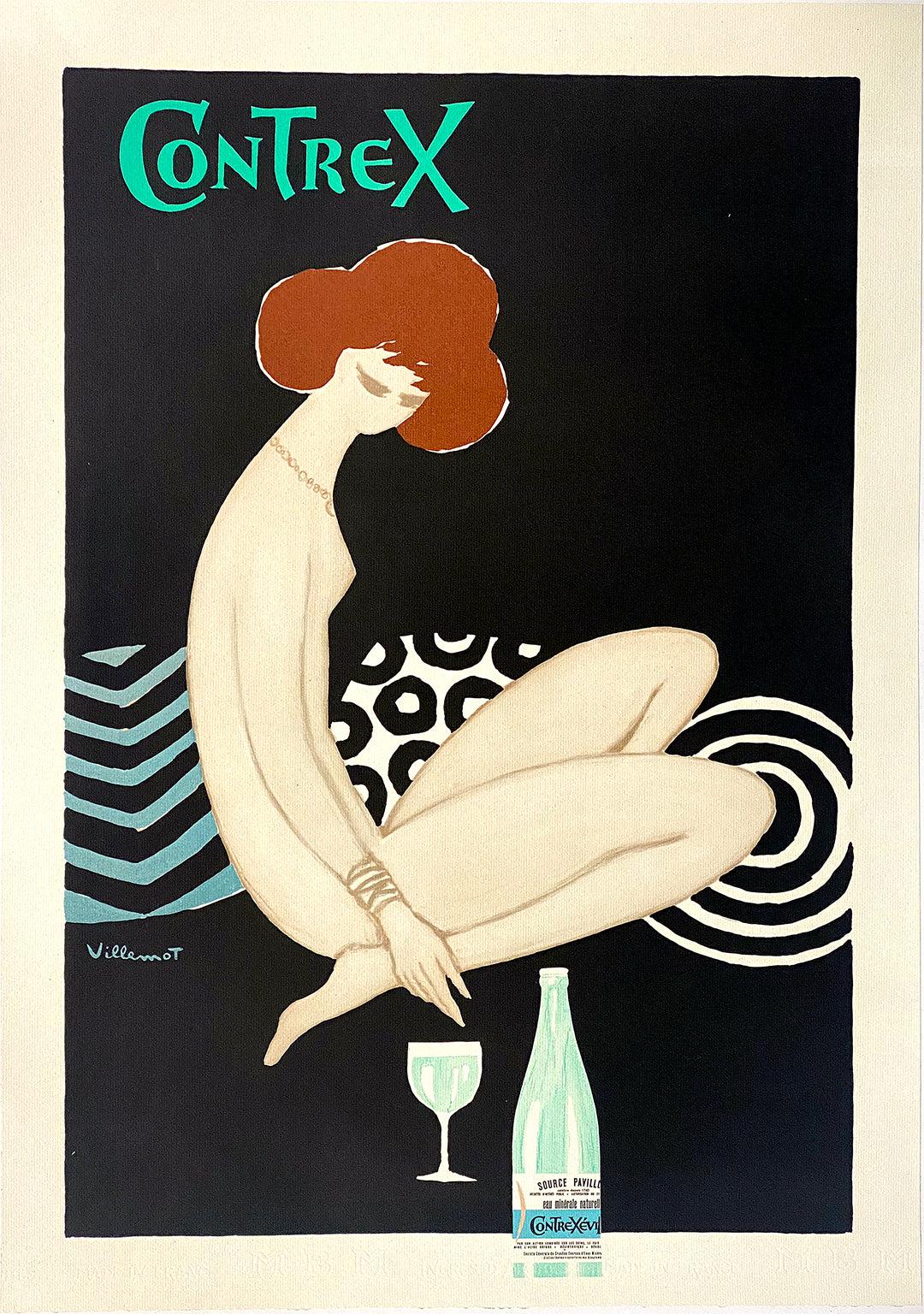 Contrex - Woman on Black is a 1974 French advertisement for Contrex Mineral Water by Bernard Villemot (1909-1989). The advertisement continues Villemot’s signature use of nude beauties in his advertising artwork. Contrex mineral water has diuretic properties and was advertised towards women as a way to keep slim.