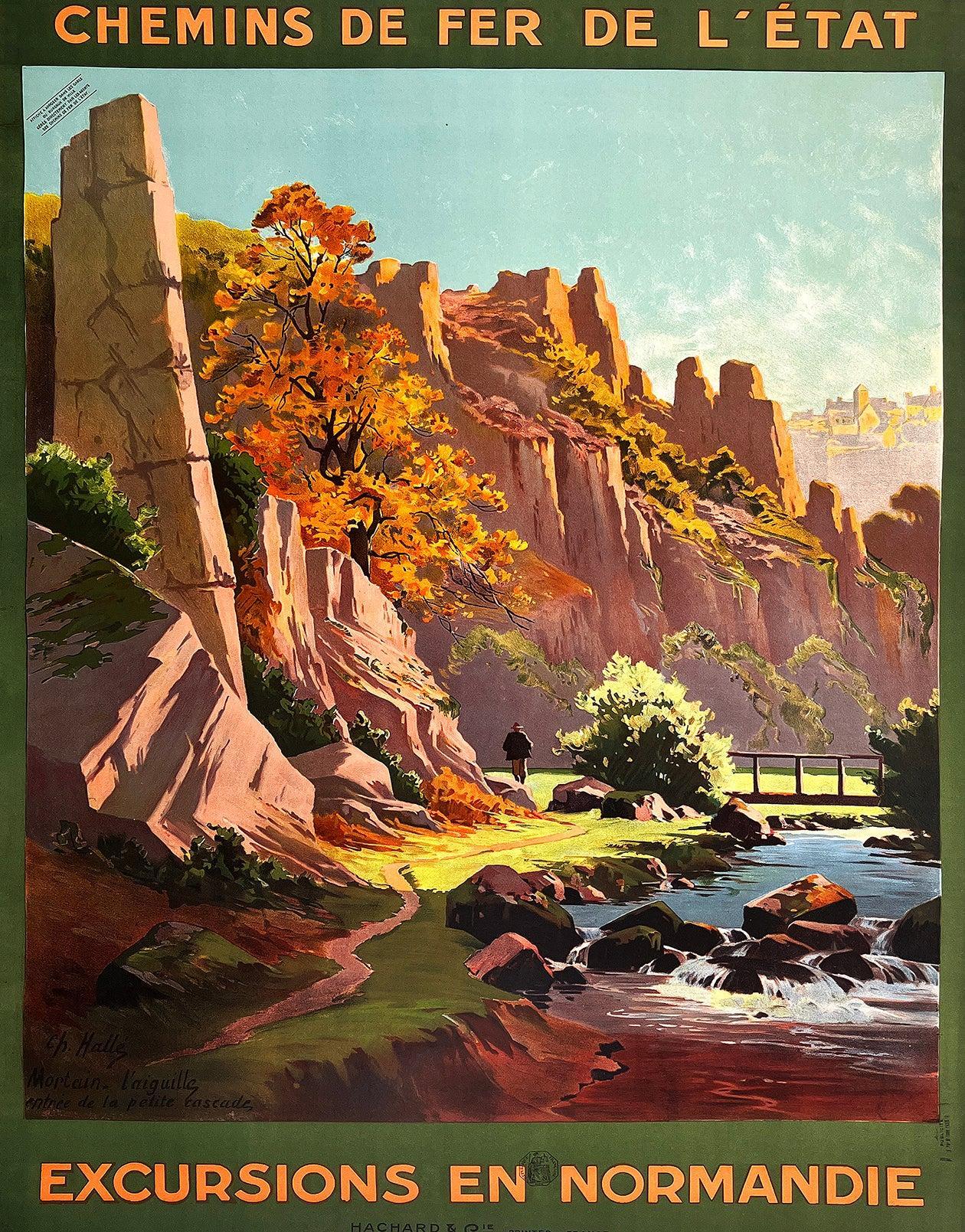 This evocative railway poster by Charles Halle, working under the name Alo, presents a romantic vision of the Norman countryside. Towering rock formations rise above a winding stream, framed by autumnal foliage and soft, natural light. The carefully balanced composition leads the eye through the landscape, inviting the viewer to imagine a peaceful excursion into nature, far from the bustle of the city. Alo’s use of warm earth tones and gentle contrasts gives the scene a timeless, painterly quality.Created to promote leisure travel on the Chemins de Fer de l’État, the poster reflects the early twentieth-century French enthusiasm for regional tourism. Normandy is depicted as a place of natural beauty and quiet contemplation, easily accessible by rail. The image emphasizes escape and discovery, aligning perfectly with the railway company’s goal of encouraging urban travelers to explore France’s diverse landscapes.Charles Halle (1882–1964), known professionally as Alo, was a French painter and poster artist active during the golden age of travel advertising. He was particularly admired for his landscape posters, which combined strong draftsmanship with a refined sense of color and atmosphere. Alo’s work often bridged fine art and commercial illustration, helping to elevate railway posters into enduring works of graphic art that remain highly collectible today.This is an Original Vintage Poster, it is not a reproduction. This poster is conservation mounted, linen backed and in excellent condition. We guarantee the authenticity of all our posters.