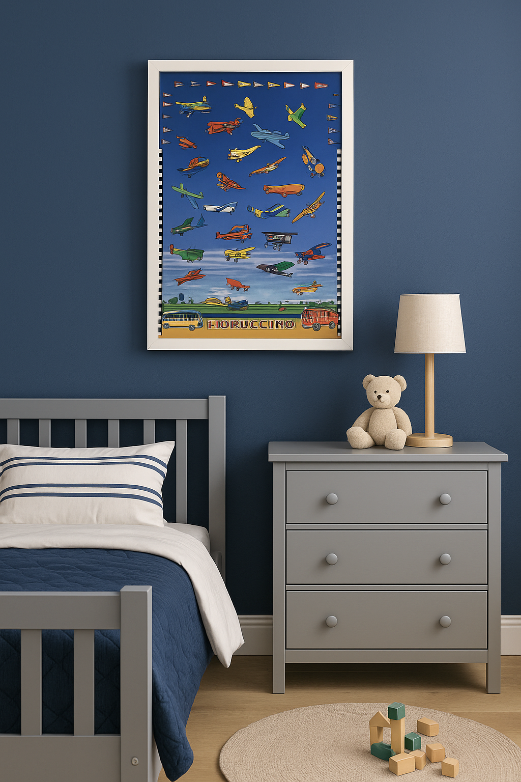A sky full of colorful airplanes streaks across a radiant blue field, bordered at the sides by a black-and-white check and capped with fluttering pennants. Biplanes, early monoplanes, and toy-like jets bank and loop above a tiny airfield, where a bus and a red fire engine anchor the ground scene. The playful, flat color and crisp outlines read like a child’s encyclopedia of flight—graphic, readable, and meant to delight—while the “Fioruccino” cartouche at bottom identifies this as part of the brand’s kids range. Designer uncredited; typical of Fiorucci’s studio-driven visuals, late 1970s–early 1980s.“Fioruccino” was Fiorucci’s dedicated range for kids—scaled-down denim, tees, and accessories delivered with bright cartoon graphics and gentle humor. Characters, vehicles, and alphabet-style motifs like this air-parade appeared on shop signage, packaging, and posters, which doubled as in-store décor and ready-to-hang room art. The simplified shapes and bold palette made the imagery easy to read from a distance and instantly appealing for nurseries, playrooms, and children’s boutiques.Founded in Milan in 1967 by Elio Fiorucci (1935–2015), the label fused Italian flair with London and New York street culture to forge a pop-forward identity—leopard prints, metallics, neon color, and cheeky, collectible graphics. Its New York flagship opened in 1976 and quickly became a cultural magnet—the “daytime Studio 54”—cementing the brand’s strong U.S. presence and making its posters, shop ephemera, and ad imagery highly sought after.This is an Original Vintage Poster, it is not a reproduction. This poster is printed on heavyweight paper and in excellent condition. There may be some minor handling marks. We guarantee the authenticity of all our posters.