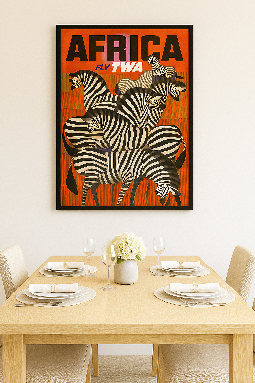 In the Post World War ll era, Howard Hughes, the owner of TWA was a dominant force in expanding and promoting the routes flown by his company. As the economy was vastly improving, airline travel for business and pleasure was on the upswing and posters such as this were instrumental in promoting this form of travel. This Africa poster was created by the gifted American artist David Klein (1918 -2005), and depicts a group of zebras as the main figures in a very geometric style. The black and white of the animals contrast perfectly with the bright reds and oranges of the background; thus giving the poster a very harmonized composition. Klein was best known for his influential work in advertising. Although he produced illustrations for Broadway theatrical productions, Hollywood films, the United States Army, and numerous corporate clients, Klein is best remembered for the iconic travel images he created for Howard Hughes and Trans World Airlines (TWA) during the 1950's and 1960's. To learn more about artist David Klein go to https://postergroup.com/blogs/the-ross-art-group-blog/david-klein-posters-as-portals-of-discovery This is an Original Vintage Poster. It is not a reproduction. This poster is conservation mounted, linen backed and in excellent condition. We guarantee the authenticity of all of our posters.