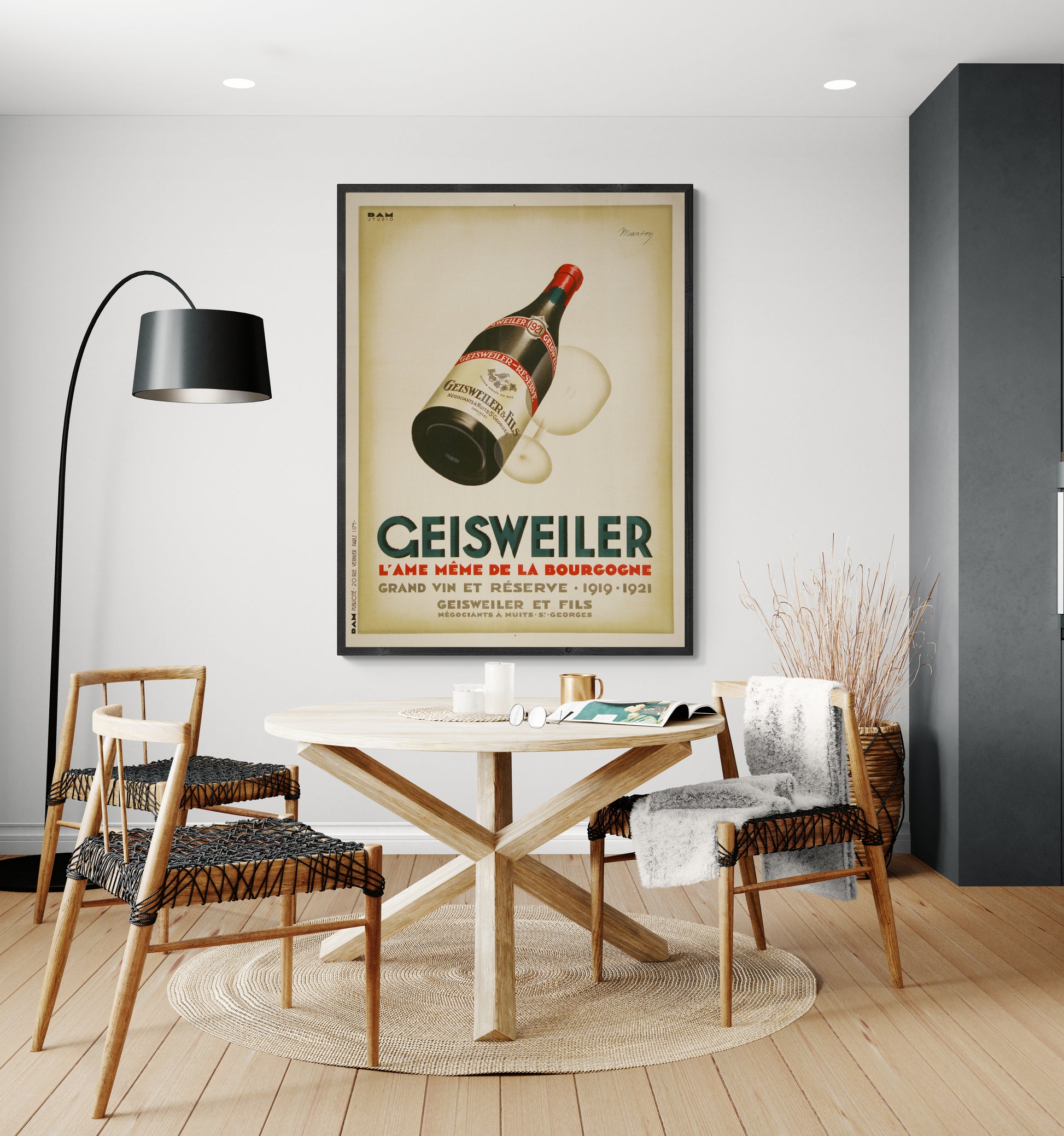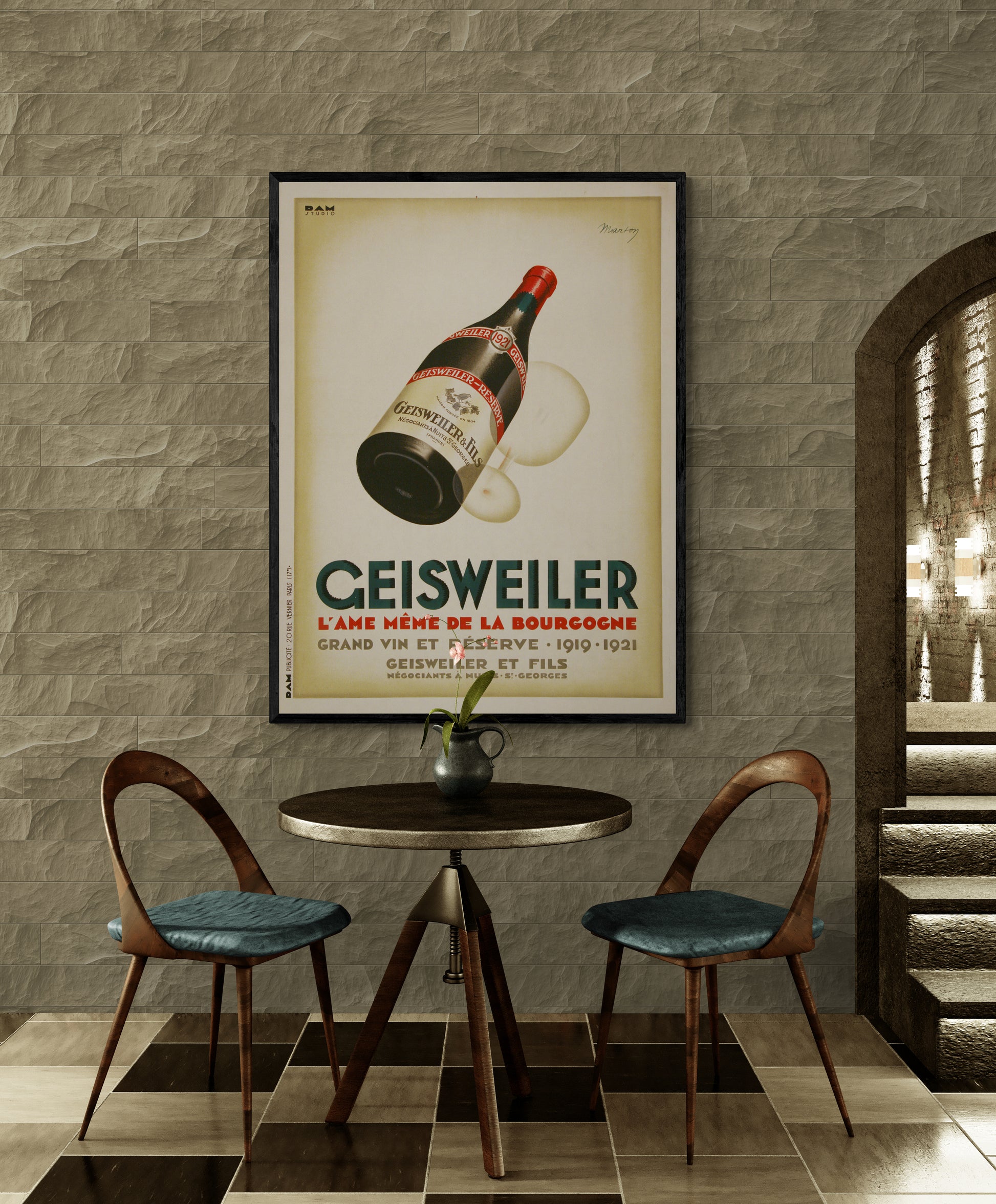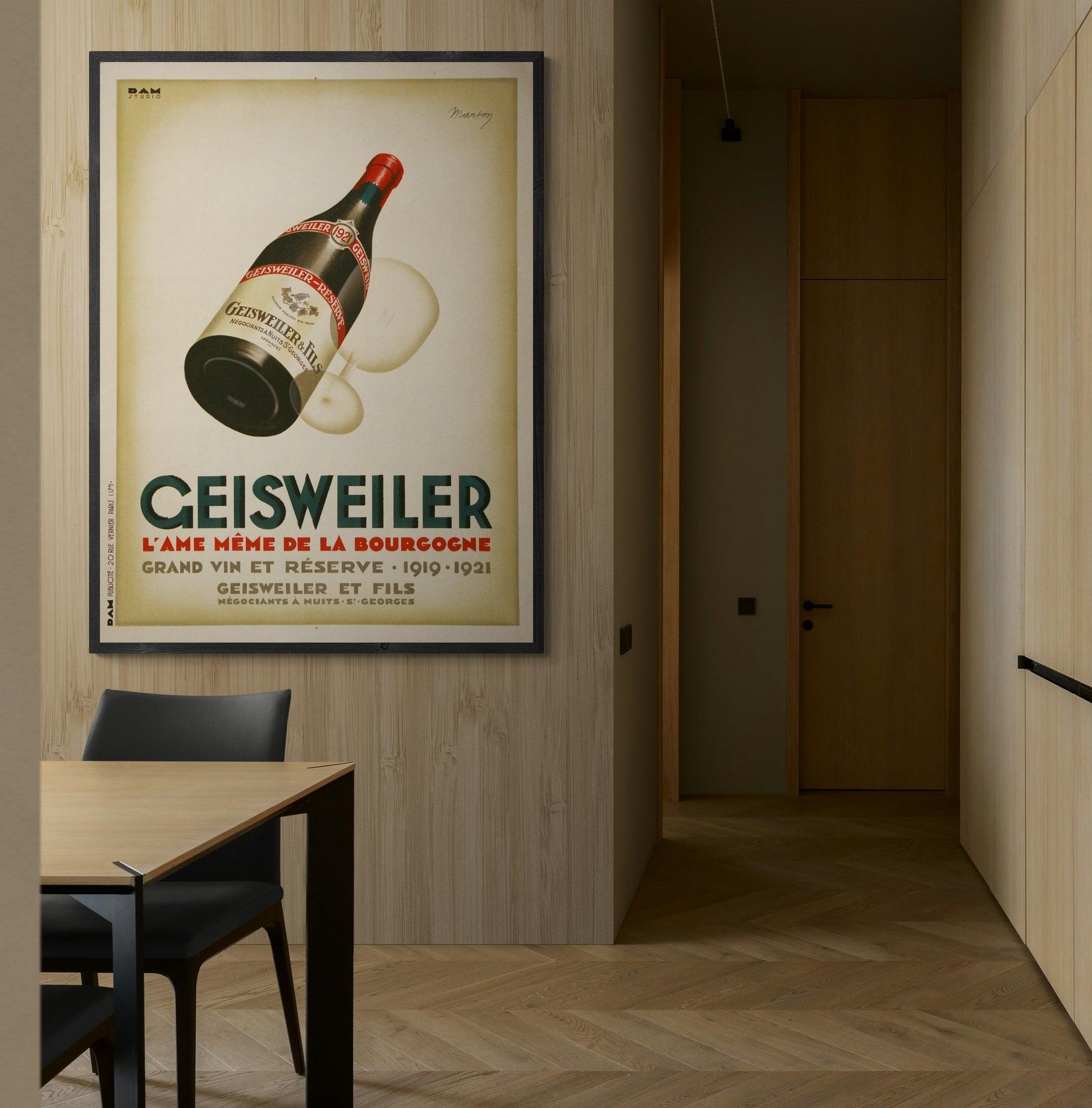 This large poster for Geisweiler is a great example of to-the-point product advertising. In the center of the image, a bottle of the wine and a clear glass are stylistically positioned set against a beige background. In the lower portion of the image, the artist Lajos Marton, uses typography and contrasting colors to catch the attention of the viewer. The text reads, "The very soul of Burgundy." Burgundy is the region in France where this wine was produced. The simplicity serves to imply that this superior product speaks for itself.