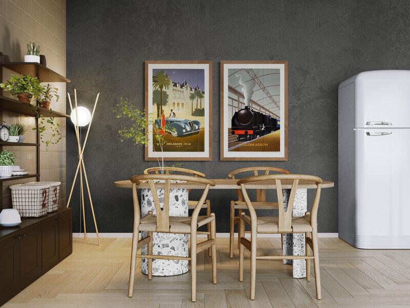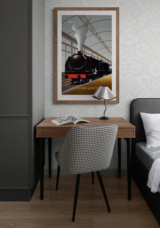 This Fix-Masseau illustrated poster of the Golden Arrow is a not only great reminder of the artist’s practiced Art Deco niche but as well a reminder of the luxury of the Golden Arrow train. The poster features crisp colorization, geometric shapes and the precise elegance of the once popular Golden Arrow. The poster shows the smooth black luxury train arriving on a fervently Deco stylized platform edge.
