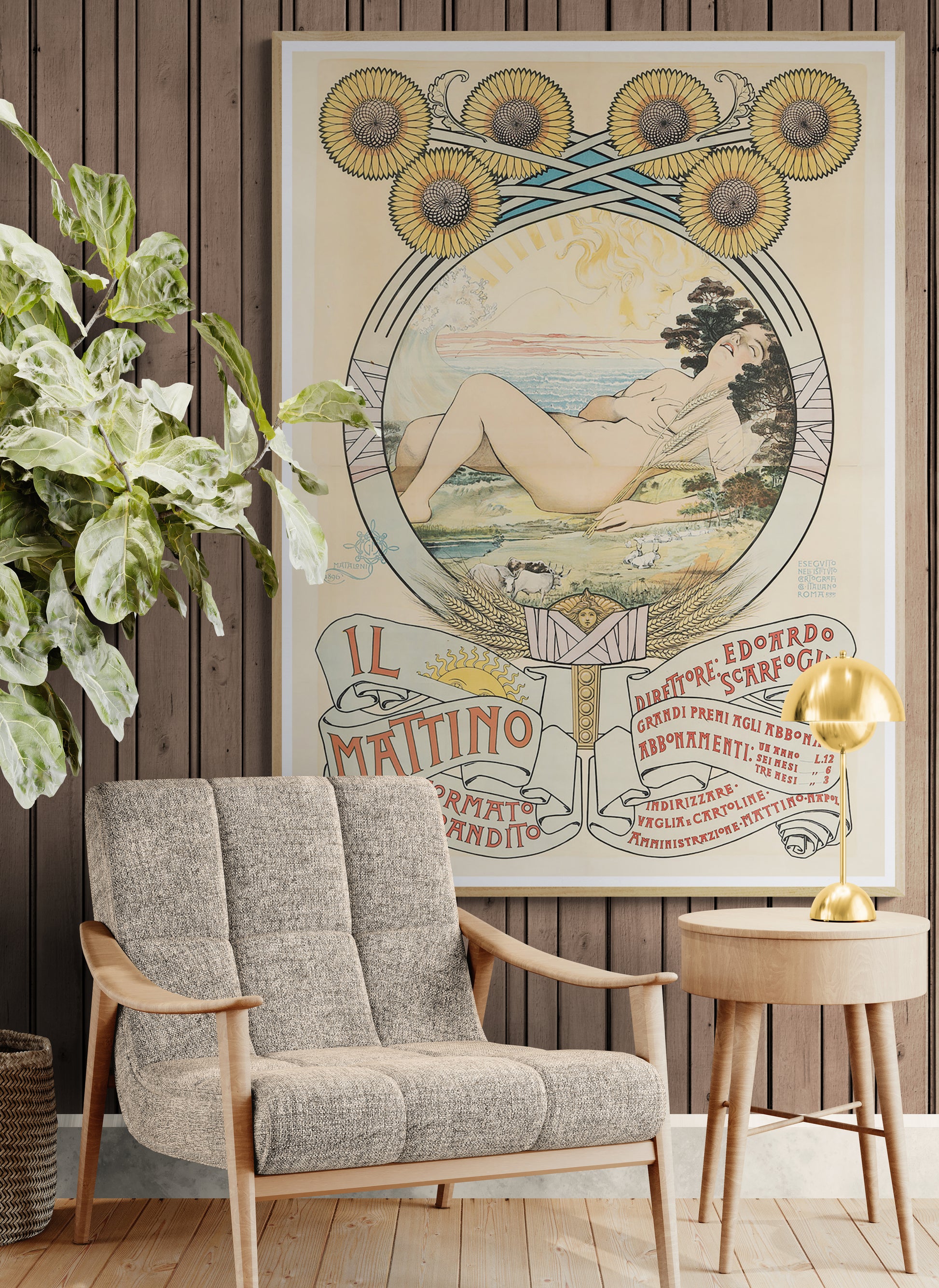 Talk about a scandalous poster! This raunchy image was created in 1896 for a newspaper, of all things. Stylistically stunning, this advertisement for the Italian daily paper, Il Mattino features the decorative elements of Art Nouveau. A beautiful nude woman reclines in ecstasy, fondling her breast and closing her eyes. She is likely to be representative of nature or Mother Earth, as Art Nouveau artists loved to reference images from the classical world. The male sun stares down at her intently, with a seaside scene between the two figures. Notice his hand, ghostlike, reaching out to touch her forearm. The entire tableau is framed ornately in a wreath of wheat and sunflowers. This rare poster was printed on two sheets of paper that have been expertly joined together into one piece in the archival linen backing process.