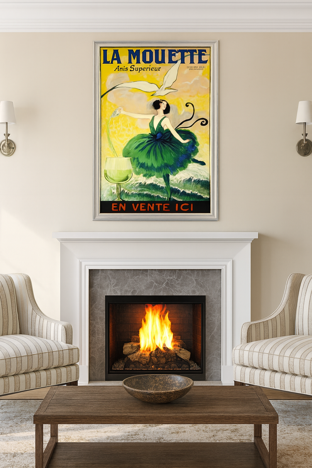 This elegant poster by Vion promotes “La Mouette,” an anis-flavored apéritif. Against a backdrop of golden sunlight and foaming waves, a stylish young woman dressed in a green, feather-like dress dances gracefully at the water’s edge, holding a glass that glows with the promise of refreshment. Overhead, a seagull (la mouette) glides in harmony with her gesture, symbolizing both the drink’s name and its light, uplifting character. The vivid contrasts of yellow, green, and blue, combined with the woman’s animated pose, capture the exuberance and sophistication of 1920s French advertising design.Like many beverage posters of the era, this composition celebrates modern leisure and seaside glamour, appealing to a generation newly enchanted with travel, elegance, and pleasure. Vion’s refined draftsmanship and dynamic composition align with the stylized, confident aesthetic of the post-war period—when advertising art became both sensuous and aspirational.The poster is attributed to Raoul Vion, a French illustrator/caricaturist and poster designer active roughly 1910s–1930s. Contemporary sources describe him as a member/exhibitor of the Salon/Société des Humoristes and primarily a magazine illustrator who also designed a small number of posters.This is an Original Vintage Poster, it is not a reproduction. This poster is conservation mounted, linen backed and in excellent condition. We guarantee the authenticity of all our posters.