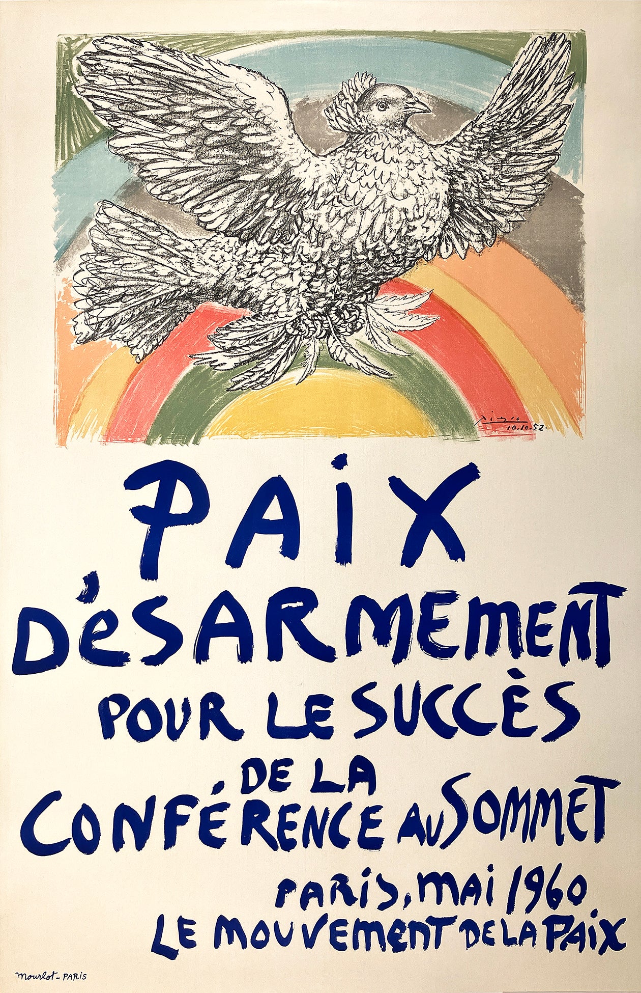 Pablo Picasso (1881–1973), one of the most influential artists of the 20th century, was a vocal advocate for peace, particularly in the aftermath of World War II and during the Cold War. His art frequently addressed themes of war, suffering, and reconciliation, and he was actively involved with the *Mouvement de la Paix*, the organization behind this poster. Created at a time of heightened nuclear tensions, *Paix Désarmement* served as a call for diplomacy and cooperation among world leaders.