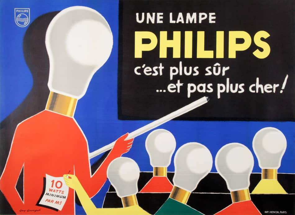 Philips - Teacher and Pupils is a c.1960 French advertisement for Philips by Guy Georget (1911-1992). The artwork depicts a school scene of lightbulb headed children receiving their lesson from the teacher. The blackboard reads "Philips lamp is safer and not more expensive." A child shows his notes to the teacher that reads, "10 Watts Minimum."