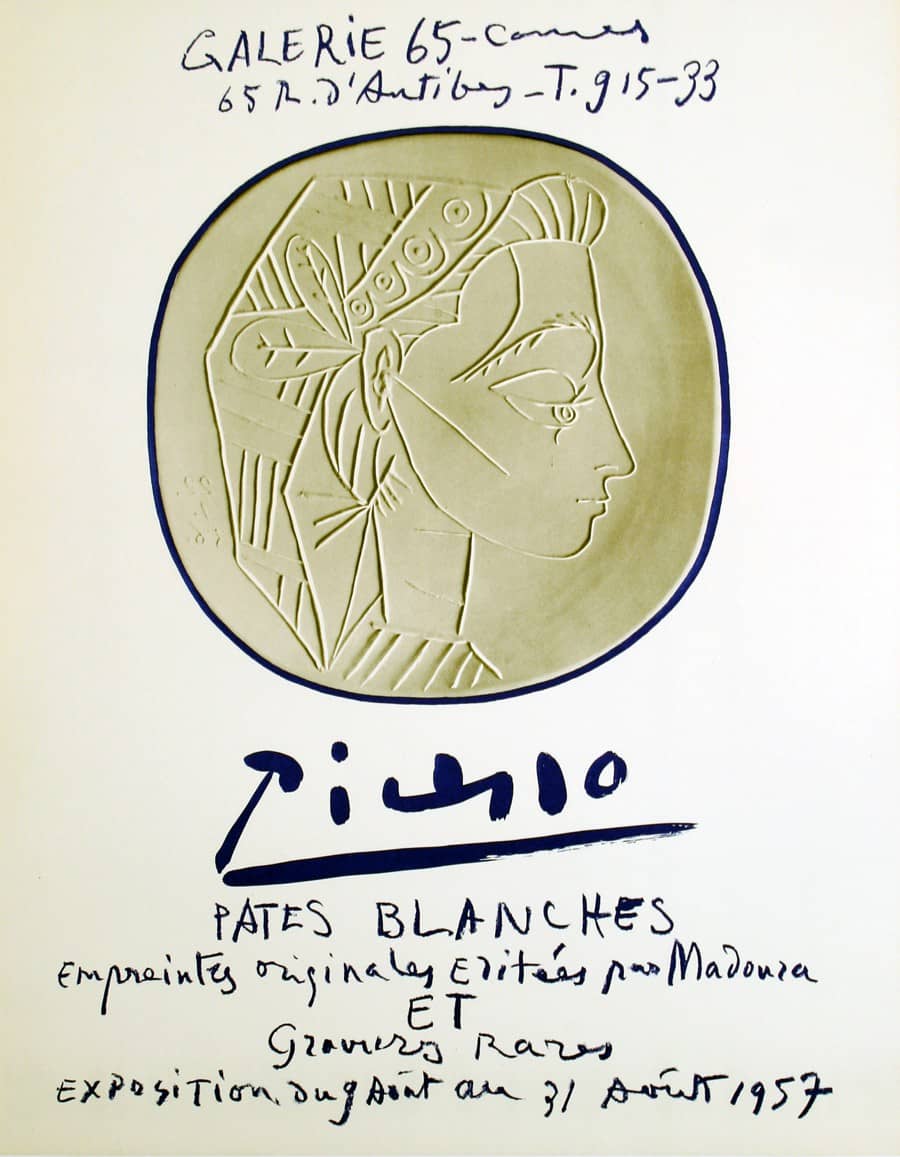 This poster for Pates Blanches at Galerie 65 aptly exhibits the well-known characteristics of Pablo Picasso style. The poster, set in white, focuses heavily on form and shape, speaking to Picasso’s profound involvement with Cubism. In the center of the image is a circle imposed with the face of a woman, embellished in geometric forms.