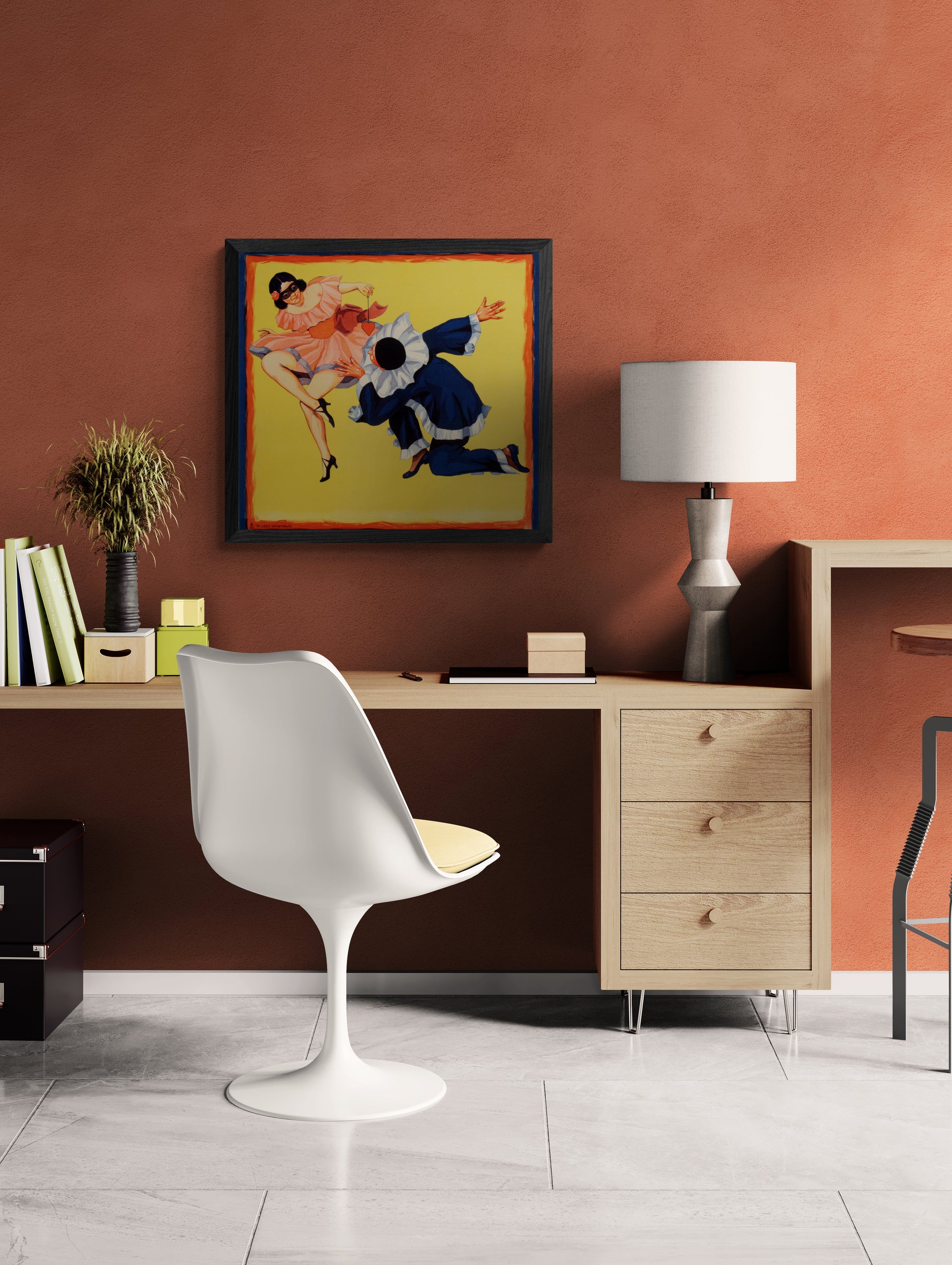 Pierrot was a character from a pantomime whose origins are in the late seventeenth-century Italian troupe of players performing in Paris and known as the Comédie-Italienne. The Pierrot character is traditionally pining for the love of Columbine, who usually breaks his heart and leaves him for Harlequin. The story and characters became a well-known classic in Europe. This vintage poster has room below the characters to place written information.