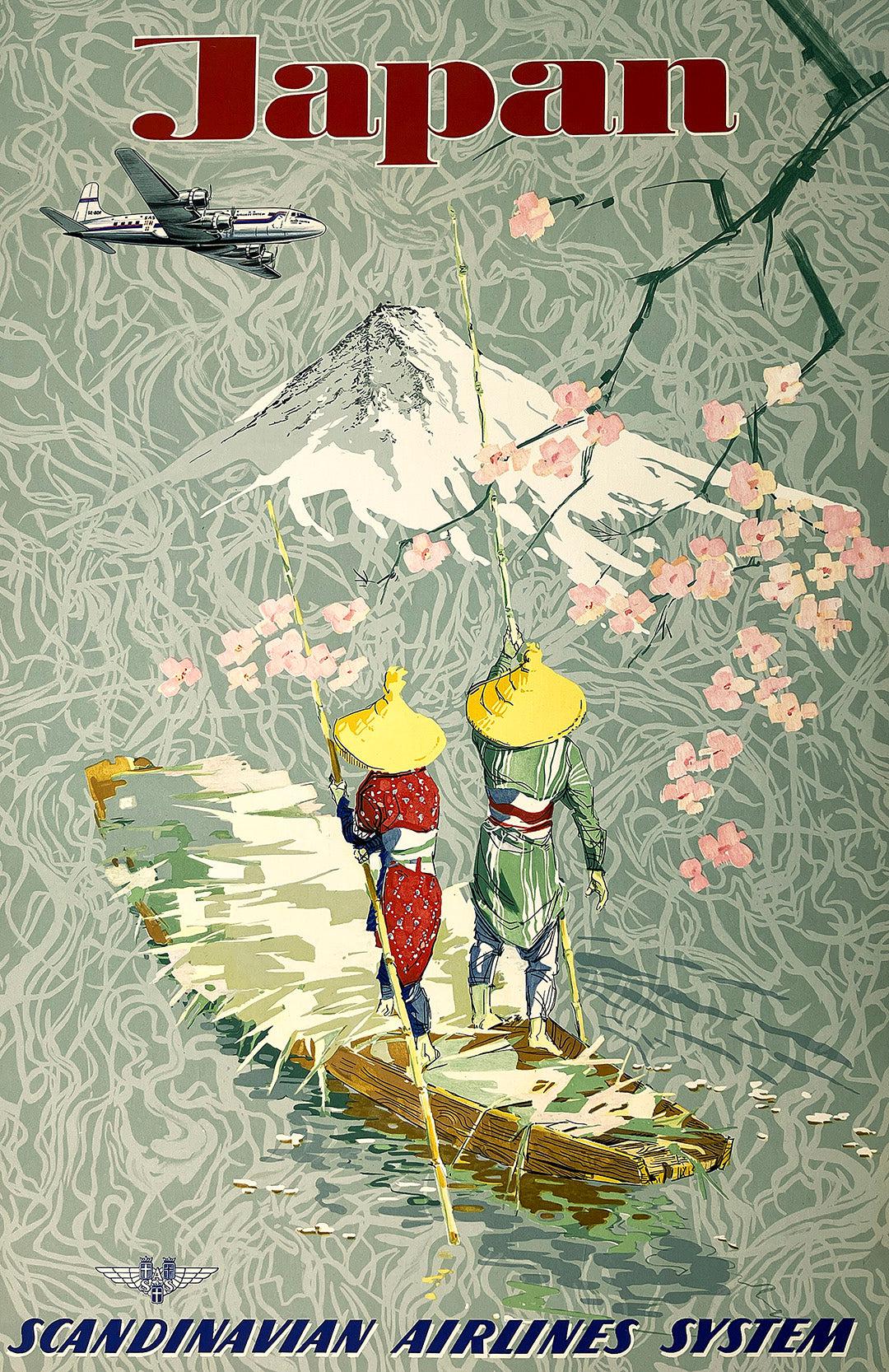 This original vintage poster, titled "Japan" and created by artist Kurt Netzler (1922-2006) in 1951, was commissioned by Scandinavian Airlines System (SAS) to promote their routes to Japan. The artwork features two individuals in traditional Japanese attire navigating a boat along a serene waterway, with the majestic Mount Fuji rising in the background. Delicate cherry blossoms frame the scene, enhancing the cultural ambiance.
