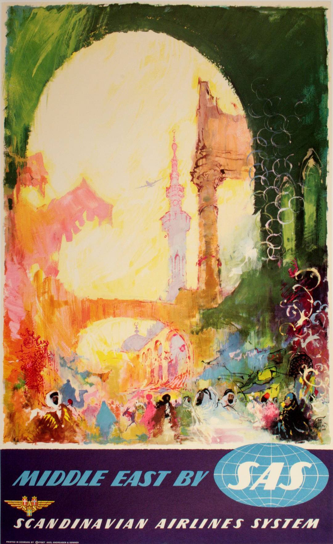 SAS Middle East Buildings is a c.1955 travel poster created by Otto Nielsen. The artwork was commissioned by Scandinavian Airline System (S.A.S.), which is known today as Scandinavian Airlines. Nielsen created many beautiful posters for SAS from 1954 to 1976. These posters showcase Nielsen's loose oil painting technique and feature the people and animal life from destinations across the globe. In this poster, Nielsen showcases a traditional Arab market scene set amongst Roman ruins.