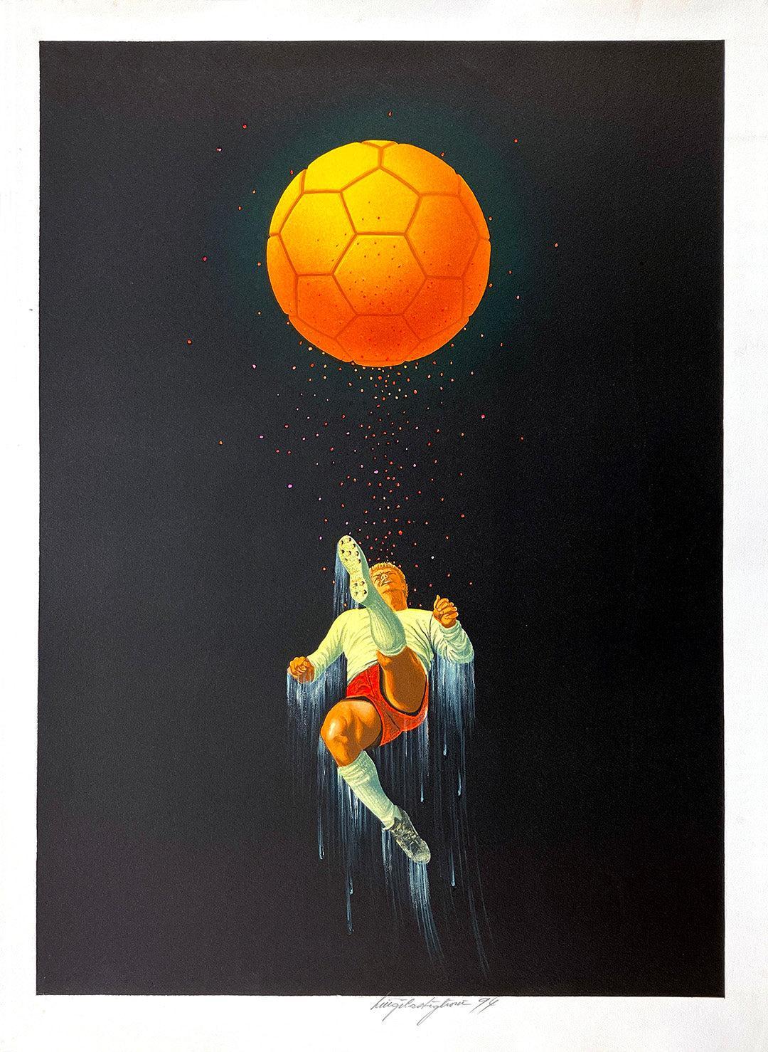 This original print by Luigi Castiglioni, created in 1994, features a dynamic and stylized image of a soccer player captured mid-kick. The composition bursts with energy: the athlete’s elongated form is frozen in a moment of graceful motion, with one leg extended to strike a vividly rendered ball. Castiglioni’s signature painterly technique—marked by fluid lines, soft color gradients, and a near-surreal sense of movement—elevates the image beyond sport into the realm of fine art.