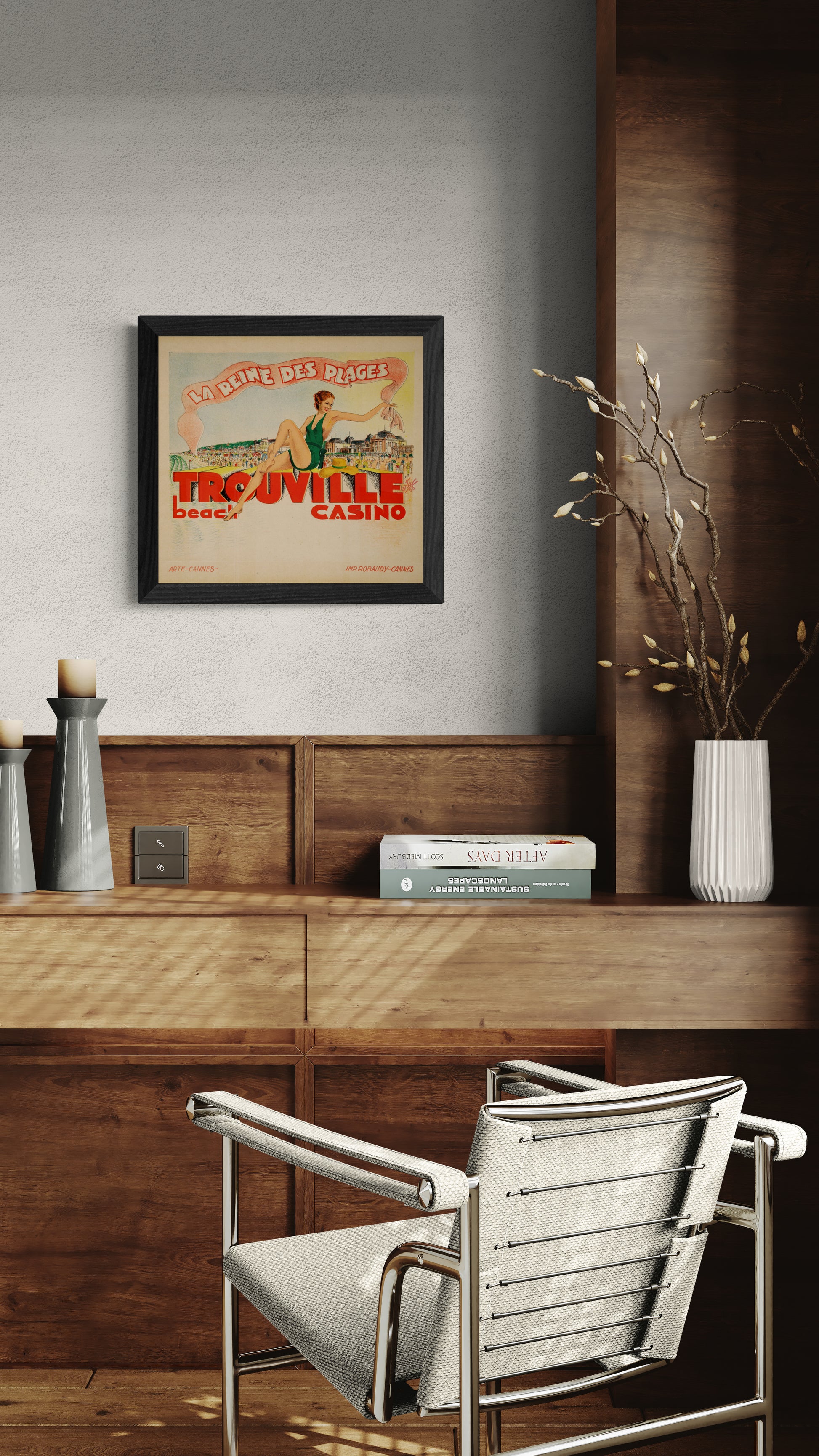 Trouville is a popular coastal resort area in the Northwestern portion of France located in the area of Normandie. It has served as a beach resort since the early 1900's. In this image we are shown the pleasures of a visit to Trouville "The Queen of Beaches" which also features a casino. This area still is popular with visitors, many of whom come for weekends from Paris.